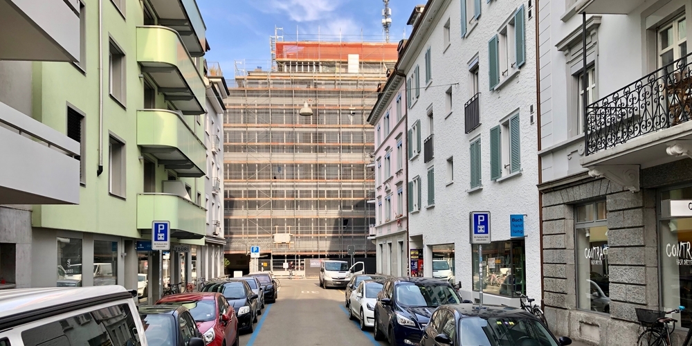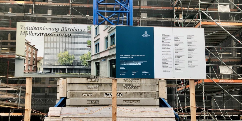 Irgendwann im Verlauf der dreiviertelstündigen Baustellenbegehung wird Mladen Tomic sagen: «Wir hätten für den Abbruch des Gebäudes ziemlich viel Geld ausgeben müssen.» Tomic ist Mediensprecher von Swiss Prime Site (SPS), der grössten börsenkotierten Immobiliengesellschaft der Schweiz, die auch das grosse Bürogebäude an der Müllerstrasse 16/20 im Kreis 4 in ihrem rund 13 Milliarden Franken schweren Portfolio hat. Er führt mich, zusammen mit Katharina Schwiete, Leiterin des Asset-Management Bau der SPS, und einem Bauleiter durch den siebengeschossigen Komplex an bester Innenstadtlage nahe beim Stauffacher. An diesem 22. Februar wird bereits intensiv an der Fassade gearbeitet. Drei Wochen zuvor sah man hier fast nur das Skelett des Gebäudes mit Baujahr 1980, das zuletzt von der Swisscom genützt wurde.